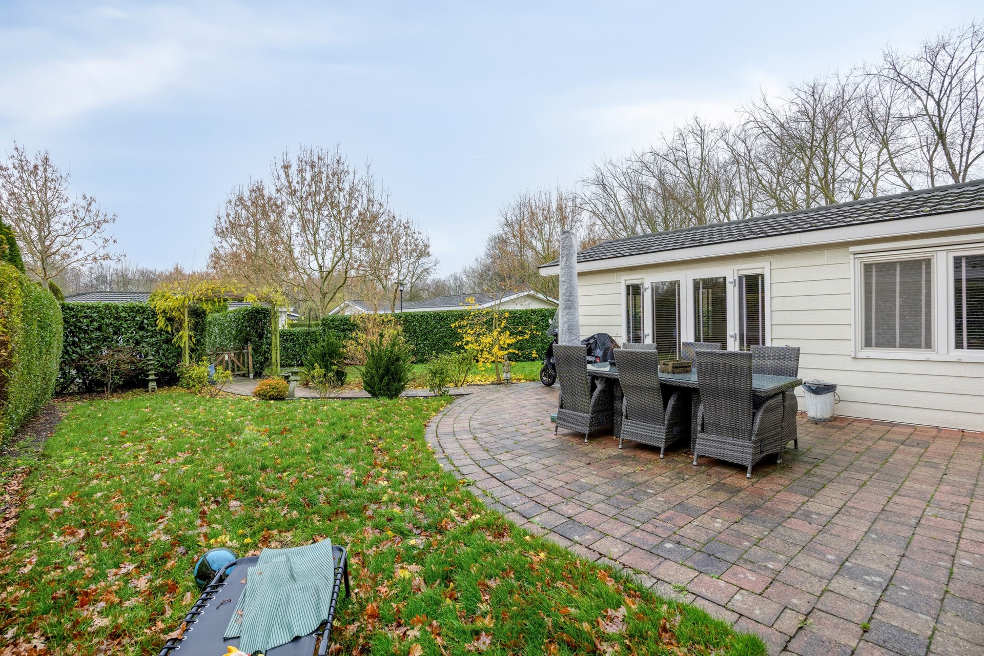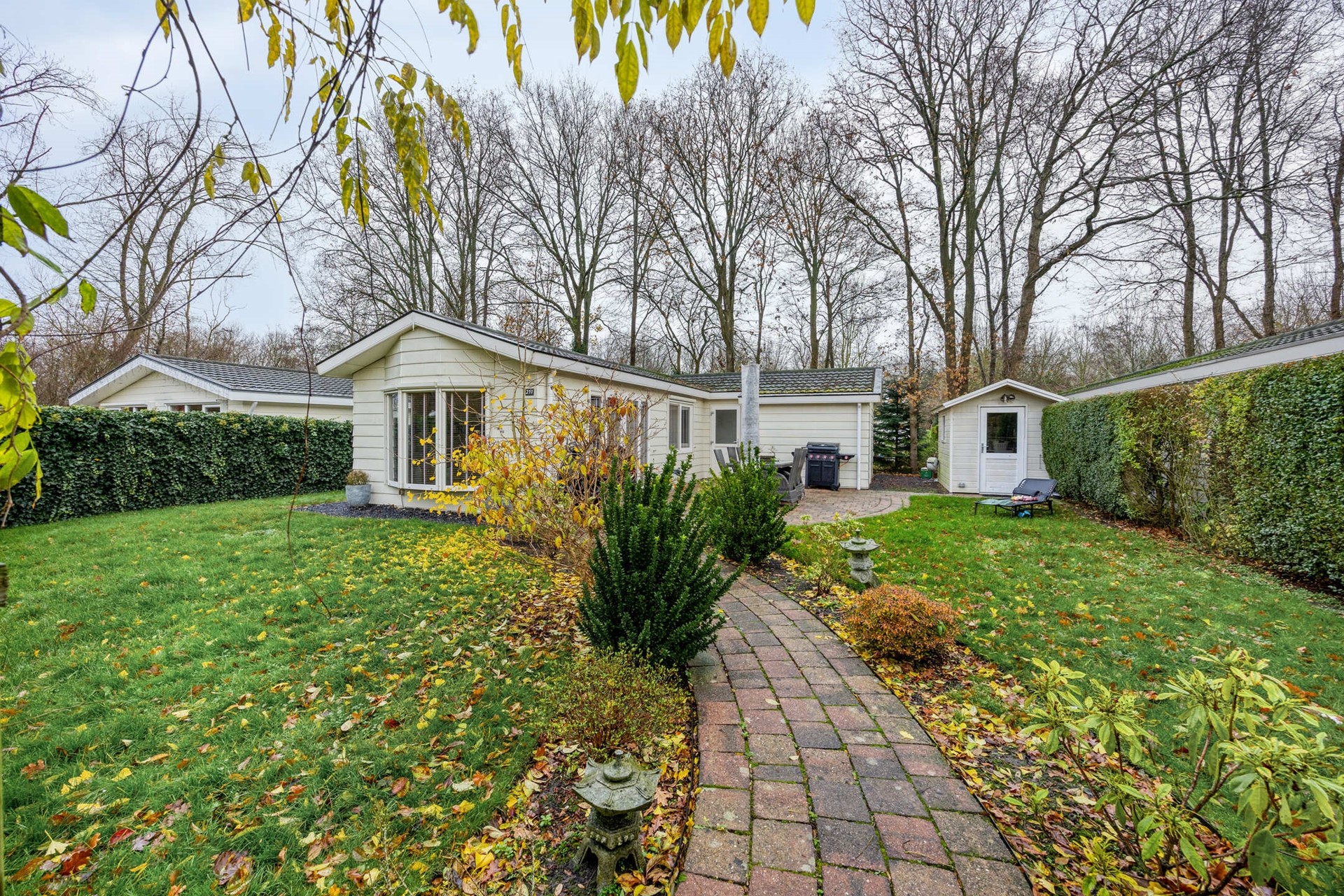 Aan de voorzijde van de recreatiewoning vind je parkeergelegenheid op eigen terrein, omringd door groen. De tuin is royaal en groen aangelegd, met een groot terras direct aan de recreatiewoning verder is de tuin omheind met een haag voor extra privacy, en een ruime berging.