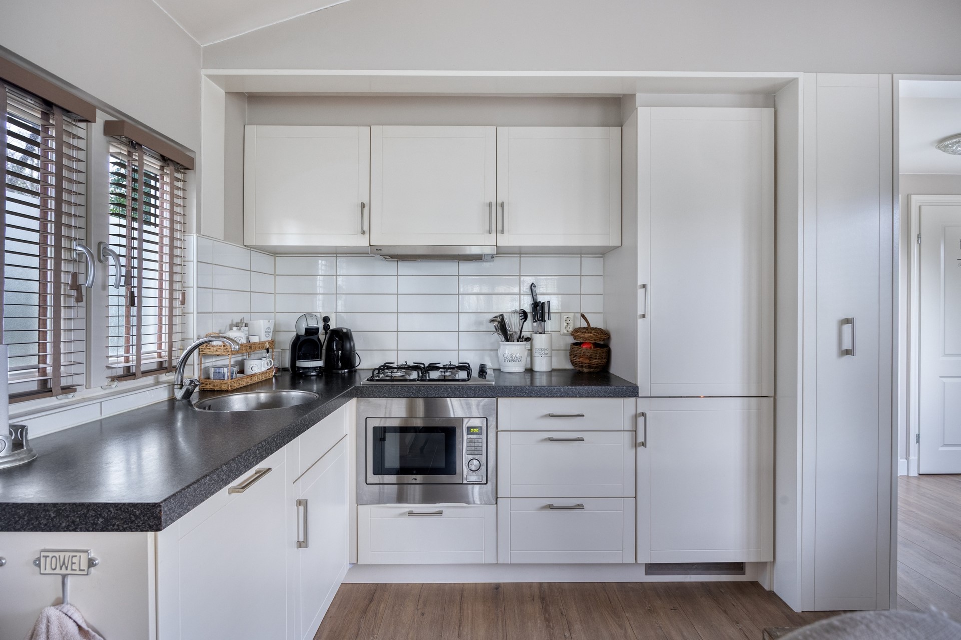 De keuken is ruim en praktisch opgezet met een licht hoekmeubel. Je hebt hier alle benodigde apparatuur, zoals een gaskookplaat, afzuigkap, combi-oven, koel-/vriescombinatie en een vaatwasser.