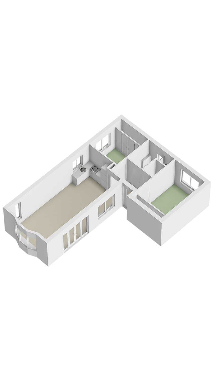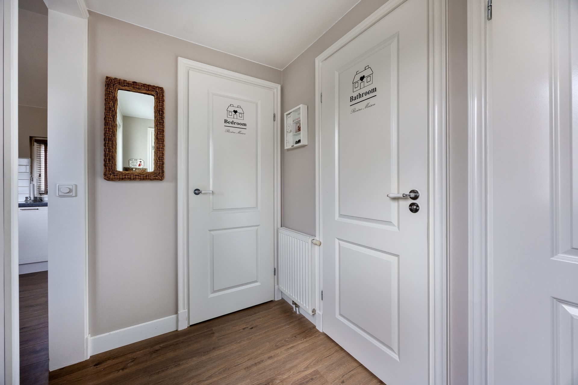 Bij binnenkomst ervaar je direct de ruimte en het licht dankzij de lichte wanden en de doorlopende laminaatvloer. De entree geeft toegang tot de badkamer met toilet, de twee slaapkamers, en de open doorloop naar de woonkamer.