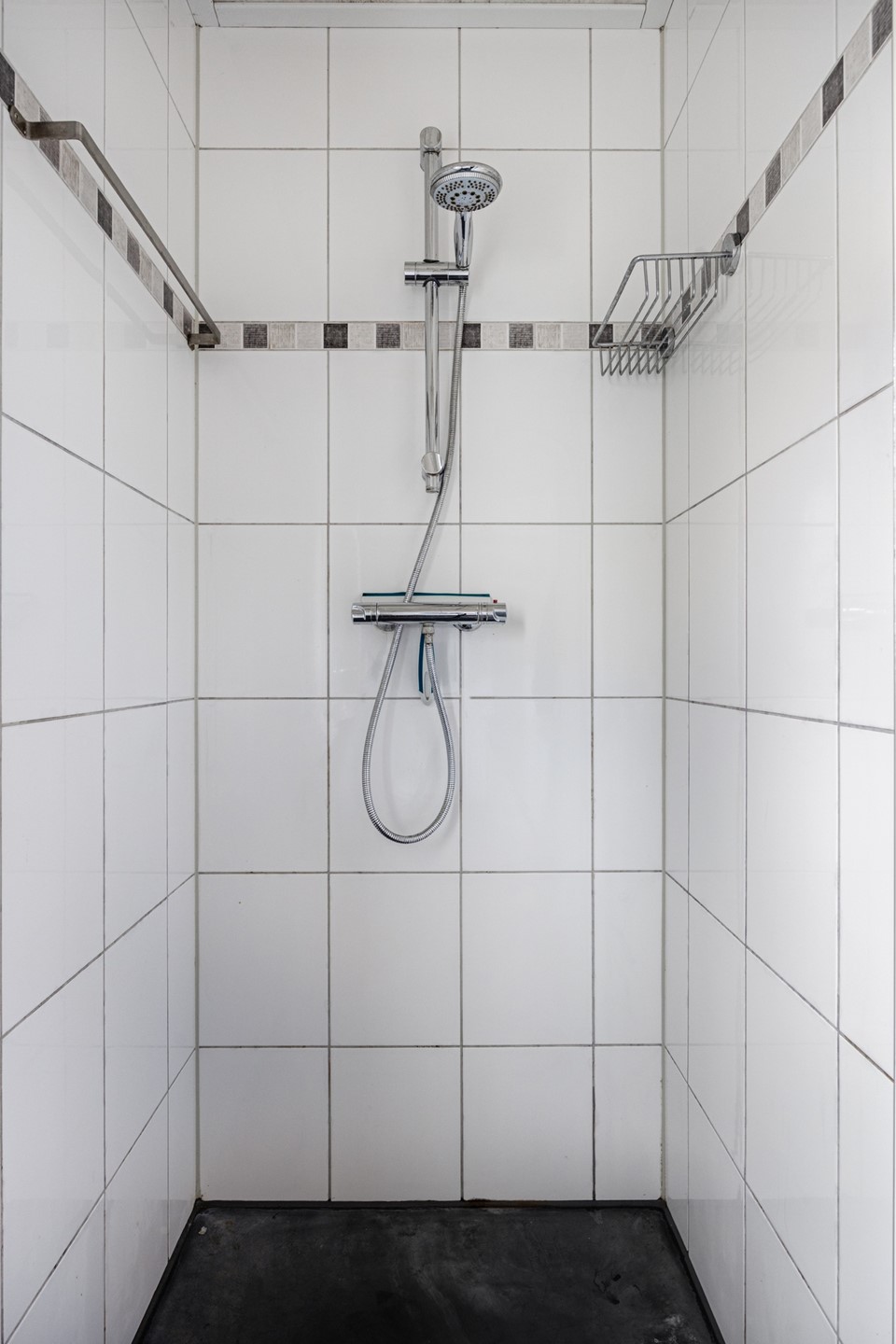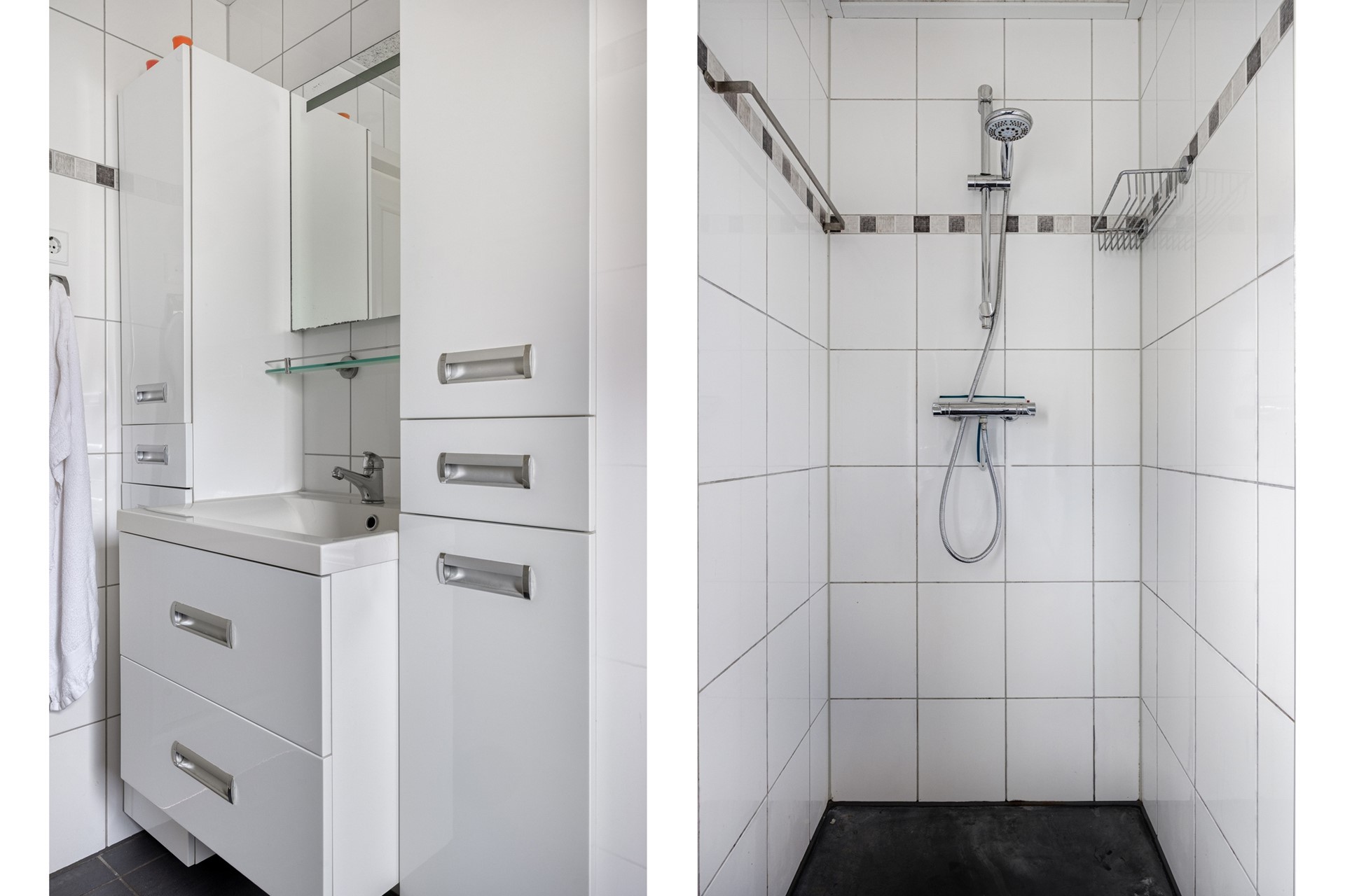 De twee slaapkamers zijn stuk voor stuk ruim en licht. De badkamer is ruim en stijlvol met lichte wandtegels, donkere vloertegels, een douche, een groot wastafelmeubel met veel opbergruimte en witgoedaansluitingen.